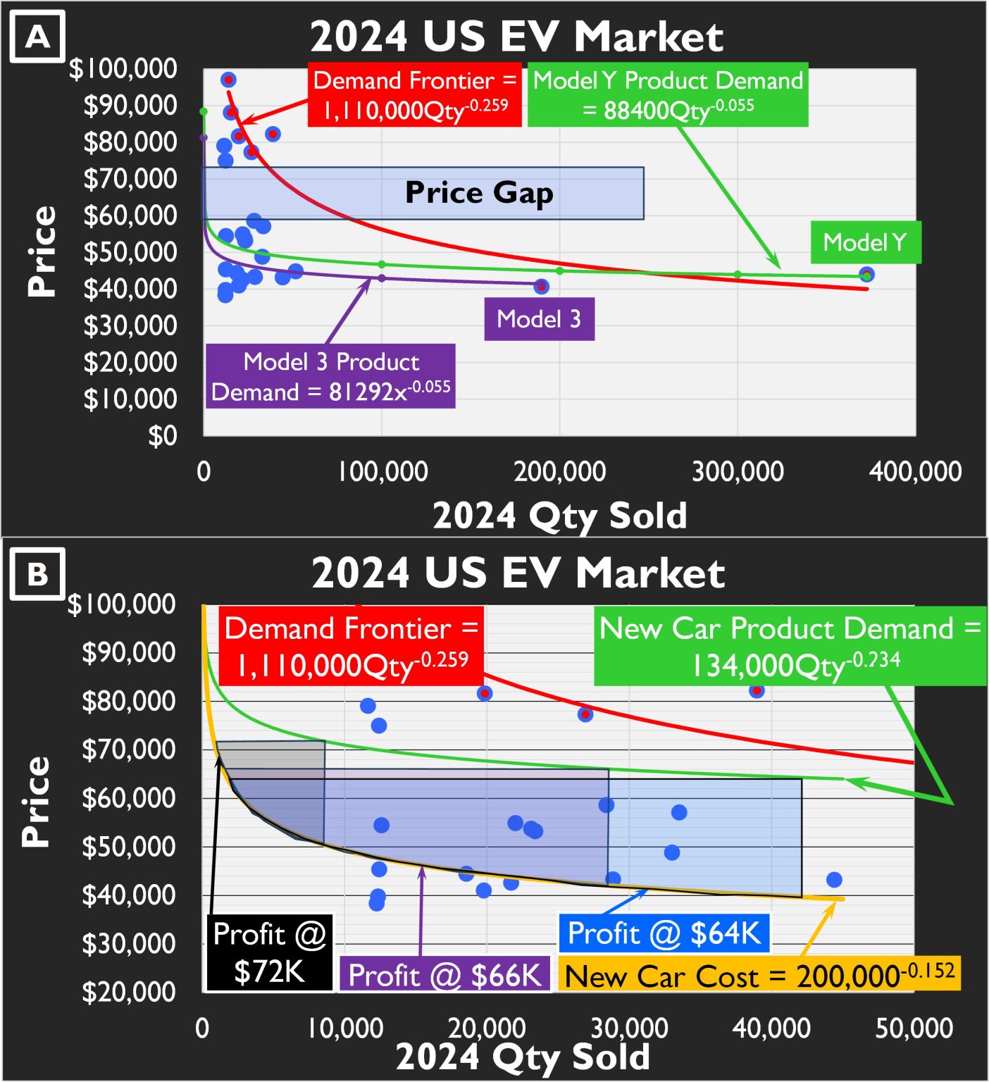 In (A), we observe that this market forms a well-correlated Upper Demand Frontier, with Tesla Model Y and Model 3 commanding the low-priced portion, where most of the market’s revenue lies. Between them, they control over half the revenue that the top 25 models produce. A company can make more money if it can drop a model’s price and cost simultaneously.
