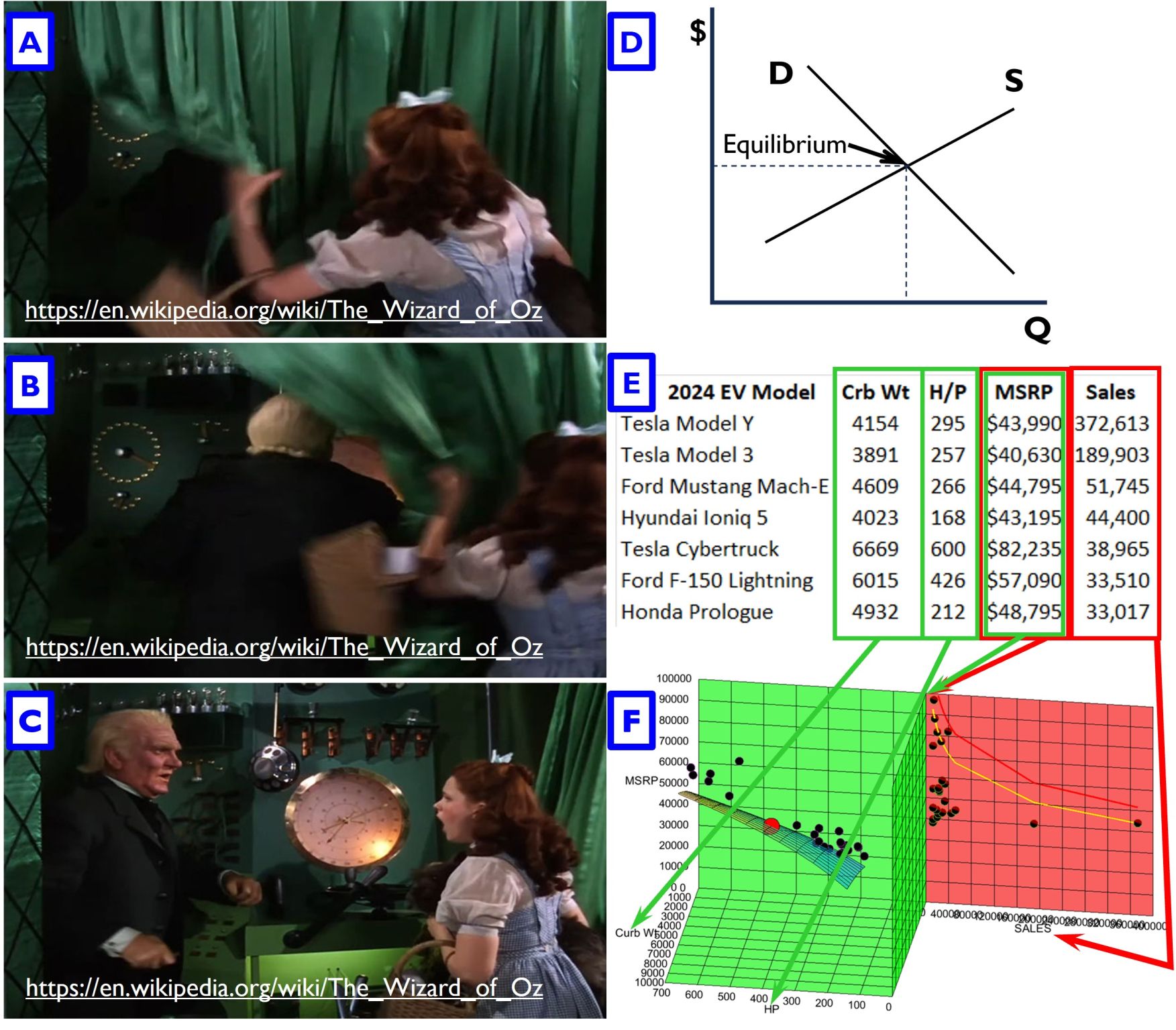 Markets form with actual data, as shown in the lower right diagram. There, 18 electric car models for sale had points in Value Space (green spheres) describing their 1) Range, 2) Horsepower, and 3) Price, with matching points (red spheres) on the Demand Plane depicting their 3) Prices and 4) Quantities sold. There is no “equilibrium point,” as models enjoy “sustainable disequilibria” when prices exceed costs.