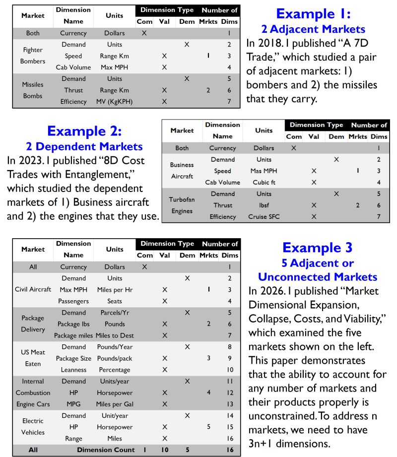 In 2018, in Example 1, working on the then-pressing issue of “Prompt Global Strike,” I wrote of a 2-Market, 7D system consisting of adjacent markets for Fighters and Bombers (Market 1) and the missiles they carry (Market 2). I then discovered that the best (i.e., affordable) way to accomplish the mission was to develop short-range hypersonic missiles and deploy them from aircraft operating from multiple forward-based airbases. The problem with the missiles was that their cost went up dramatically with range. Ignoring this caution, the USAF went ahead with its 1000-mile hypersonic AGM-183A missile. It was canceled after one was built (as the analysis suggested in advance). The USAF is restarting this program. It was too expensive before. It will fail financially again.