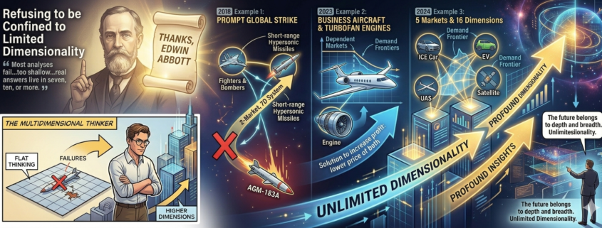 Example 3, issued this year, covered five markets and 16 dimensions simultaneously. Among other things, the work done there revealed that Internal Combustion Engine (ICE) cars and Electric Vehicles (EVs), despite having different product forms, both lie on the same Demand Frontier because they perform the same function. In the same vein, Unmanned Airborne Systems (UAS) performing reconnaissance shared the same Inner and Upper Demand Frontiers as satellites performing the same function. Who knew these platforms had common sales limits until we did the multidimensional analysis?